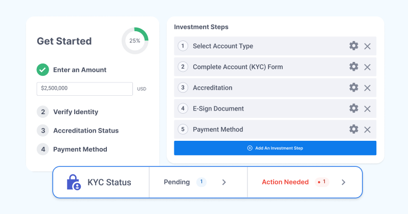 Customize investor workflows to meet your income verification standards. Complete KYC / AML checks anywhere in the flow required, and Authenticate emails on entry. Our platform flexibility meets the needs of any workflow, ask us how!