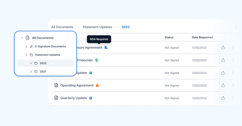 Store and organize documents for investors and funds in one secure location. Bring your data center to investors and prospects fingertips! Our simple setup allows your team to communicate updates to your contacts by providing a centralized way to review pitch decks, financial reports, and legal documents.